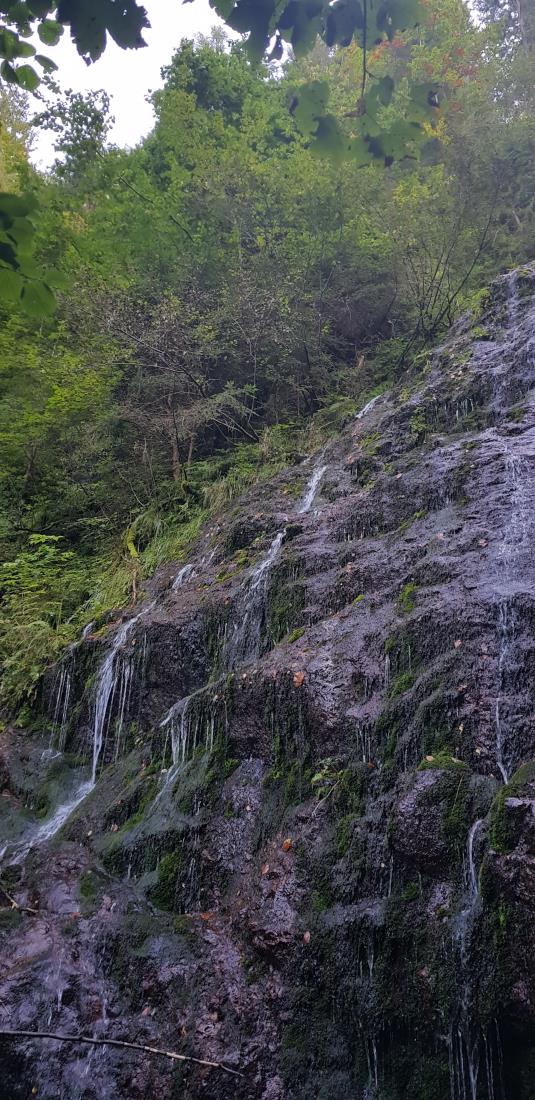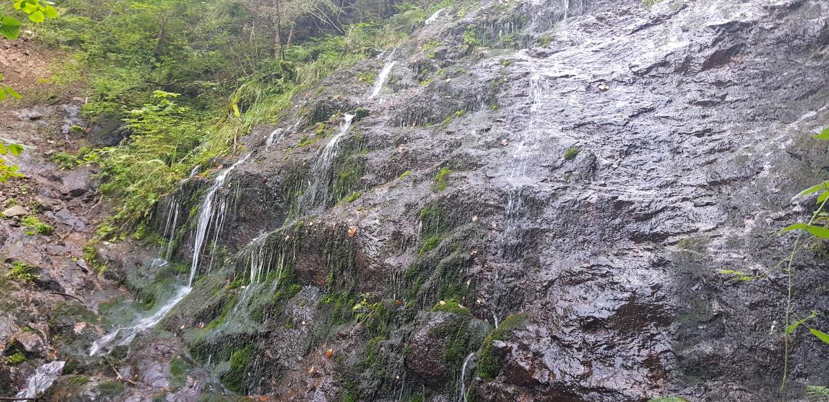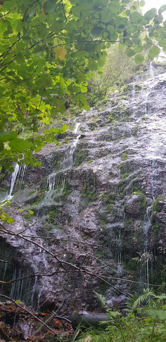 Not far from the Božič farm, above Črna na Koroškem, flows a stream which forms quite a high waterfall. In the upper section the waterfall flows in a single mass, whereas in the lower section it branches into fine 'hair-like' streams of water. The waterfall is easily accessible and an outing here is suitable for everyone. There is a lot of water in the spring and autumn, but in the summer the waterfall is merely a moist wall. The waterfall is accessible from Črna na Koroškem – Božič farm. It is easy to reach from the road Črna–Javorje: after 2 km on the road to Javorje there is a fork to the right which leads to Najevska lipa, follow this fork a further 2 km uphill along a well maintained dirt road towards Božič farm. Božič waterfall can be seen from the road.