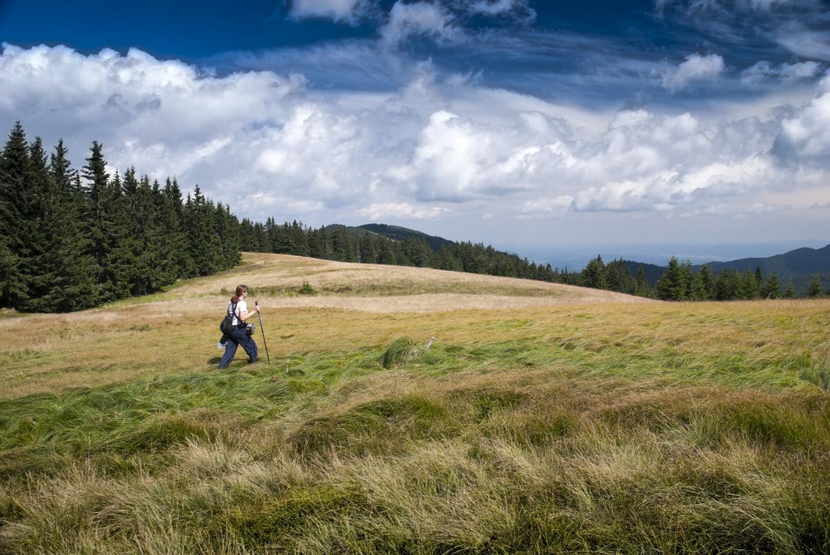SMERKOVEC:1377 m above sea level (hut) KOMEN:1684 m above sea level ALTITUDE DIFERENCE:307 m WALKING TIME:1,5 h From the lodge on Smrekovec we can continue our path to the top of Smrekovec 1.577 m (30min), to Krnes 1.613 m (1hour) or to Komen 1.684 m (1,30 hours). From the lodge we rise at the edge of the forest in the northeast direction through a forest and in 15 minutes we reach a small flat ground area where a path turns towards the right, the path to the top of Smrekovec. There is only 15 minutes of unmarked road towards the top. To get to Komen we have to turn west at the crossroads for the top and continue on a flat path, across the overgrown grazing grounds of the Kumpaška mountain. We cross a stream and follow a path that is deeply rooted into the thick soft grass and between the rocks we get to the forest. It is only a short walk in the shade and we are on the main ridge. Wide grasslands of the Kogovnik mountain start here and we cross them quite quickly. In the spruce tree sorest the path starts to climb and after 15 minutes we get to the beginning of the Ramšak mountain. Here we find a crossroads where we can climb onto the east hillside of Krnes in 10 minutes and return back to the marked road to the west. Past Krnes the blazes lead us on the southern hillsides and in a very short time we again reach the ridge between Krnes and Kom. Above the ridge the path climbs very steeply to a flat area on the south side of Komen. It is a 5 minute walk on soft grass to the chapel. The top is only a few steps to the North. This path is easy.