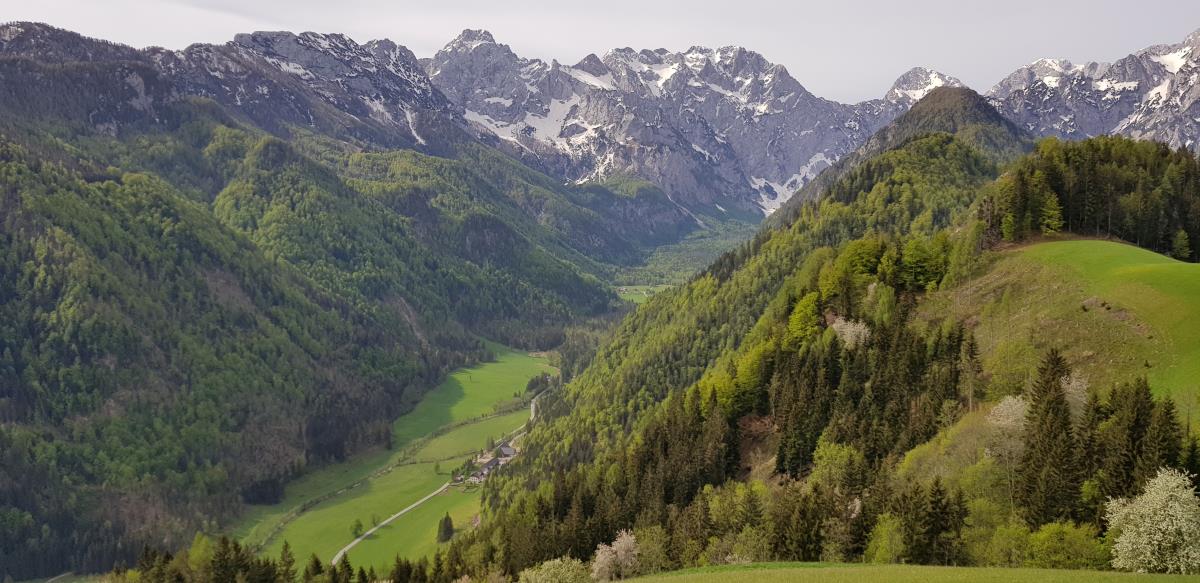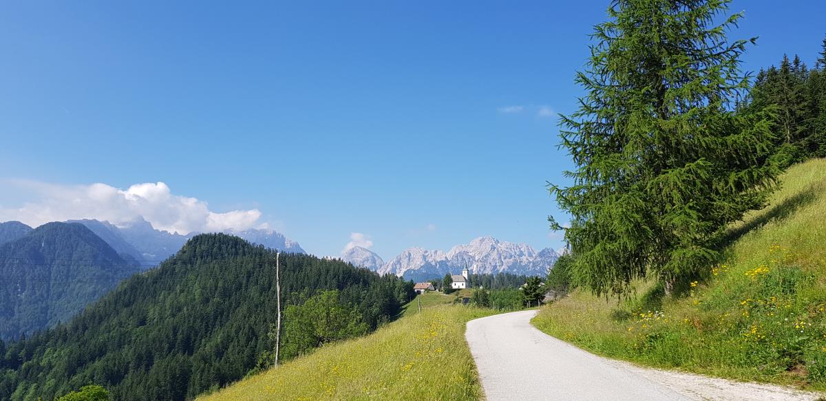Nach etwa 5 km Aufstieg auf der Asphaltstraße folgt eine wenig befahrene Schotterstraße mit einem mittelschweren Aufstieg bis zur Kreuzung auf Sp. Sleme. In der Kreuzung geradeaus auf dem Feldweg bis Zg. Sleme kurz vor dem Fuß der Ouschewa weiterfahren, dort eröffnet sich eine wunderschöne Aussicht auf Raduha und die umliegenden Berge. Es folgt eine Abfahrt über den Feldweg, danach setzen wir die Fahrt auf der Panoramastraße bis zur Kreuzung zum Paulitschsattel fort. Die Straße ist sehr abwechslungsreich mit einigen Aufstiegen und Abfahrten vorbei an zahlreichen Bauernhöfen mit wunderschöner Aussicht auf das Logarska Tal und die Steiner Alpen. Es folgt ein Aufstieg über die Asphaltstraße auf den Paulitschsattel, wo wir die Staatsgrenze überqueren und die Fahrt mit einer kurzen Abfahrt und einem Aufstieg fortsetzen, danach erwartet uns eine wilde Abfahrt über eine gewundene Straße bis nach Eisenkappel, wo wir kurz hinter der Brücke rechts in Richtung des nächsten Bergpasses Luschasattel abbiegen. Von Eisenkappel steigt die Straße die nächsten 7 km leicht, danach folgen 5 km steilen Aufstiegs bis zum Luschasattel. Dort schließen wir uns in der Kreuzung der Straße, über die wir bei der Petzen-Tour gefahren sind, an. Um nicht über das Koprivna-Tal nach Črna zu fahren, biegen wir nach etwa einem Kilometer hinter der Staatsgrenze links ab und setzen die Fahrt mit einem 3 km langem Aufstieg entlang der Staatsgrenze zum Sattel fort. Es folgt eine Abfahrt über das Topla-Tal (eins der schönsten Täler) am Fuß der Petzen bis nach Črna.