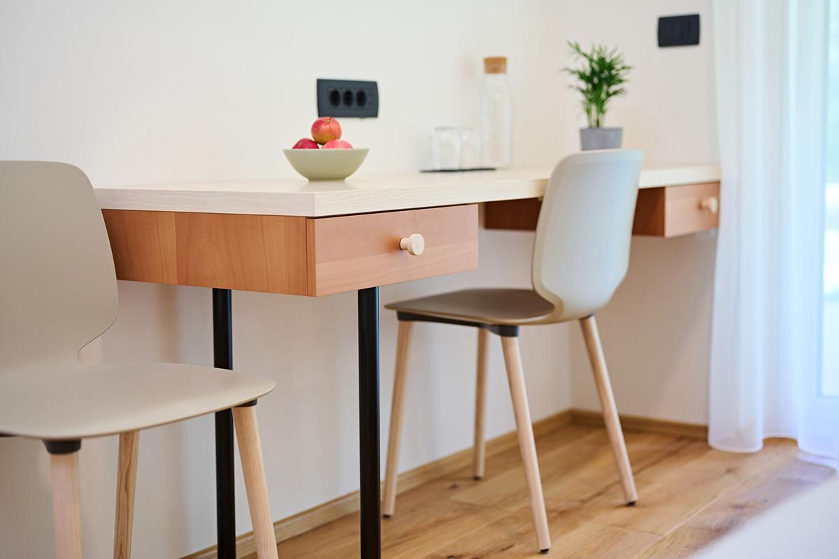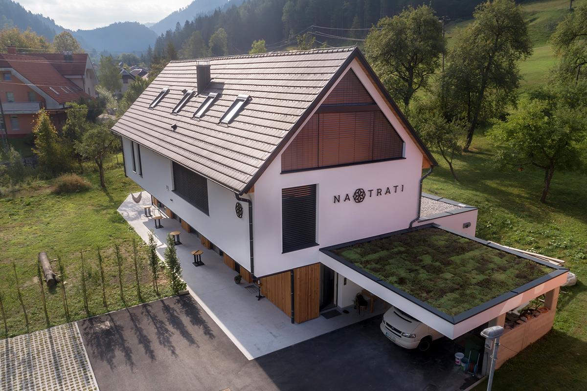 Na trati - hiša za goste je locirana v samem centru Črne. Gostom nudimo 4 sobe z dvema posteljama. Sobe so moderno opremljene z lesenim pohištvom in velikimi drsnimi vrati na privat teraso. Vsaka soba ima lastno kopalnico s tušem in wc-jem. Velika drsna vrata/okna nudijo veliko dnevne svetlobe in preprost izhod na teraso, kjer je zelenje na dosegu treh korakov. Vključno s centralnim prezračevanjem in visokimi stropi nudi gostu svež občutek spanja skoraj na prostem. Poleg 4 sob imamo v mansardi večjo družinsko suito/sobo z večjo kopalnico in dnevnim prostorom, veliko dnevne svetlobe, zračnosti in možnosti obešanja visečih mrež. V nastanitveni ponudbi je vključen zajtrk s čim več lokalno pridelanimi sestavinami in dobro kavo.